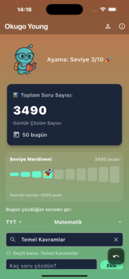 Okugo Mini, LGS hazırlığında sana eşlik eden kişisel çalışma ajandan. Günlük çözdüğün soruları kaydet, deneme sınavlarını not et, ilerlemeni takip et ve kendi hedeflerinle yarış.